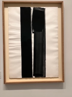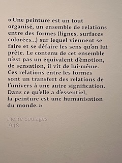 Ce sont spécialement des peintures sur papier avec du brou de noix. Ce qui s’est passé d’assez étonnant  pour moi, c’est que pour une fois je me suis laissé entrainé par les textes, soient explicatifs, soient témoignages directs de Pierre Soulages , et que progressivement je pénétrais et comprenais, une démarche, l’importance d’un trait, la trajectoire, la notion de temps, d’espace, de profondeur. De la largeur d’un trait, d’un sens politique et poétique. L’exposition respectait un ordre chronologique avec des premiers traits en 1940 puis leur progression jusqu’aux années 2000 ! 60 ans de traces, de couches , de recherches, avec du papier et du brou de noix. Du noir, des noirs différemment profonds, des teintes et des reflets du brou qui évoluent au gré des décennies , jusqu’à la quasi disparition du blanc  du papier.